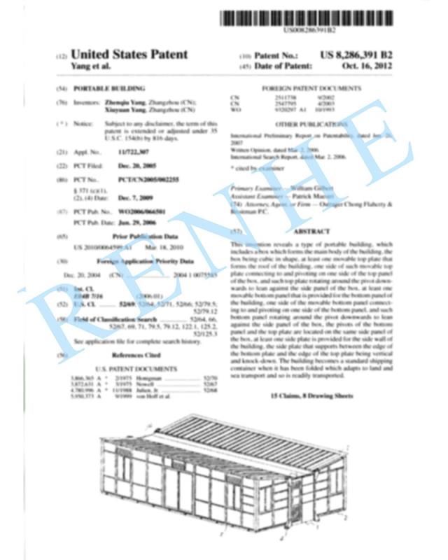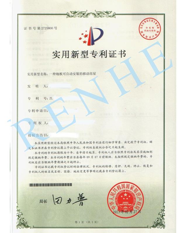 一種地板可自動(dòng)安裝的移動(dòng)房屋實(shí)用新型專利證書