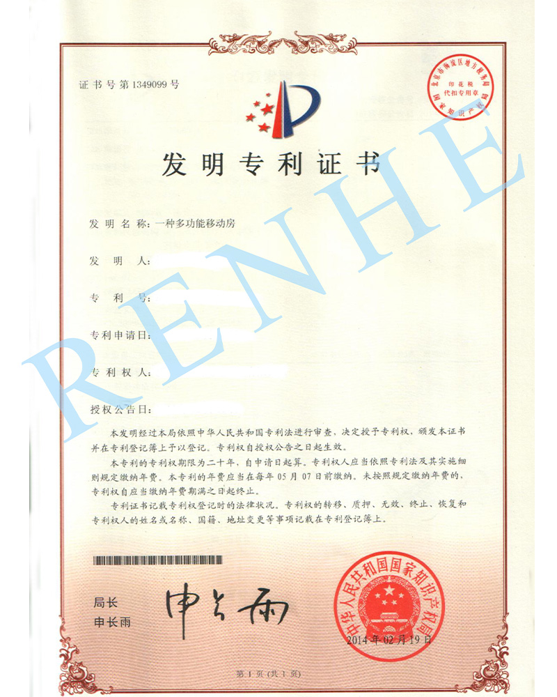 一種多功能移動(dòng)房發(fā)明專利證書