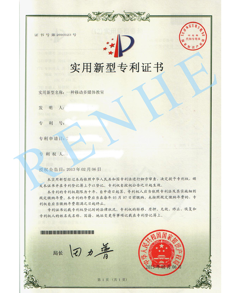 一種移動(dòng)多媒體教室實(shí)用新型專利證書