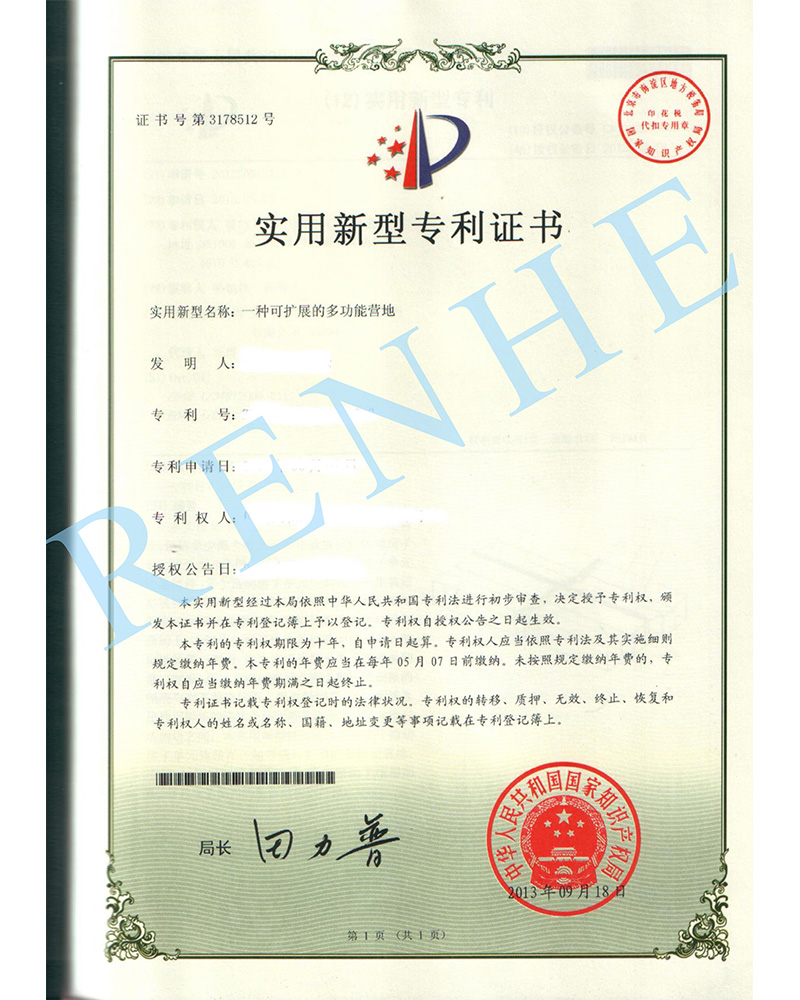 一種可擴(kuò)展的多功能營(yíng)地實(shí)用新型專利證書