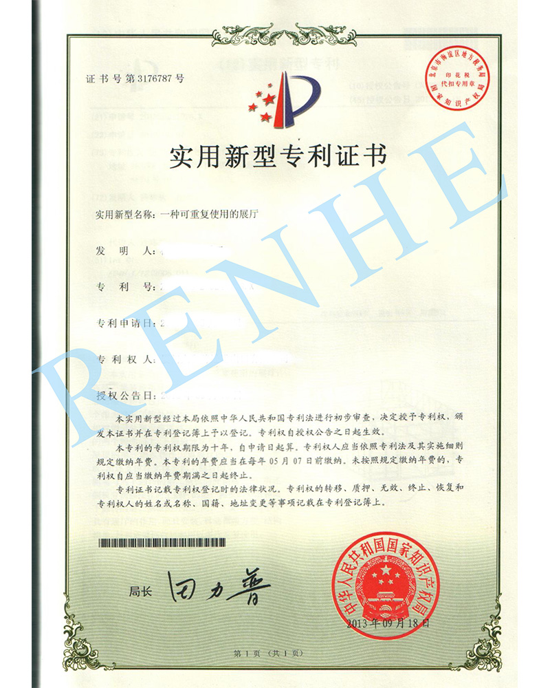 一種可重復(fù)使用的展廳實(shí)用新型專利證書