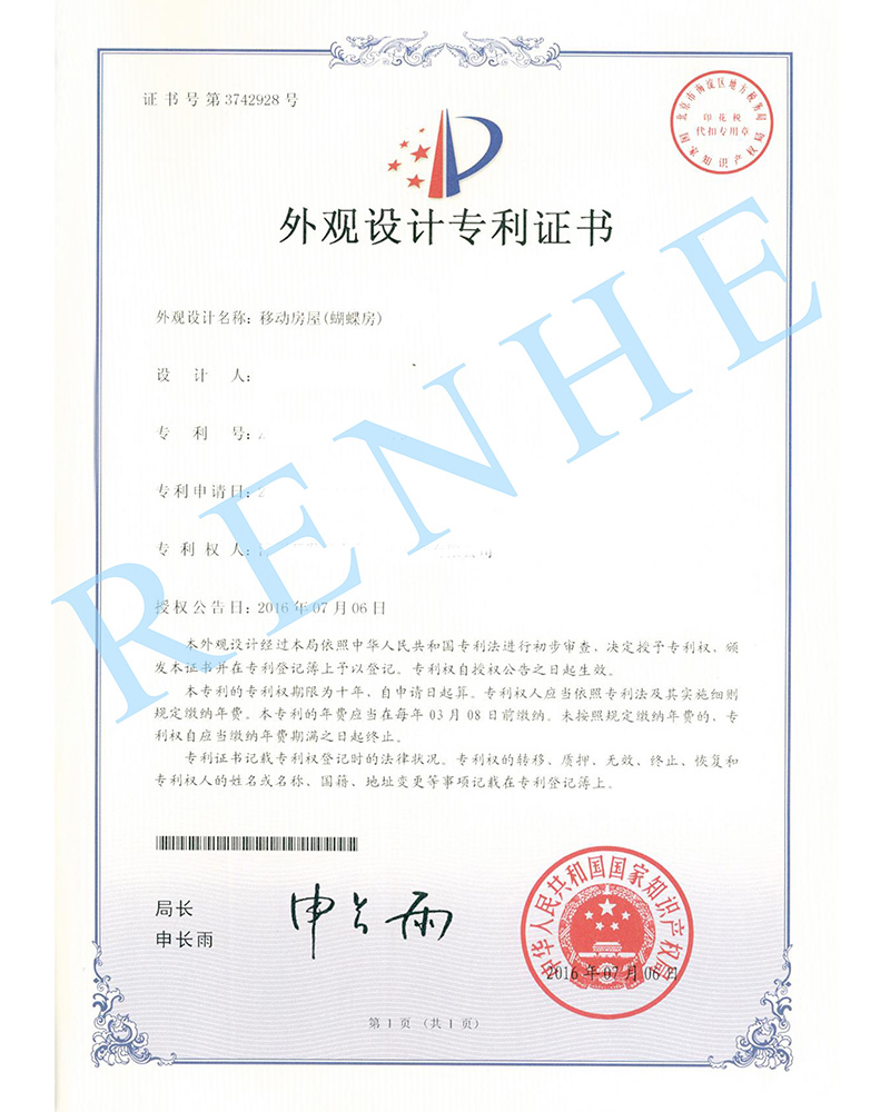 移動(dòng)房屋(蝴蝶房)外觀設(shè)計(jì)專利證書