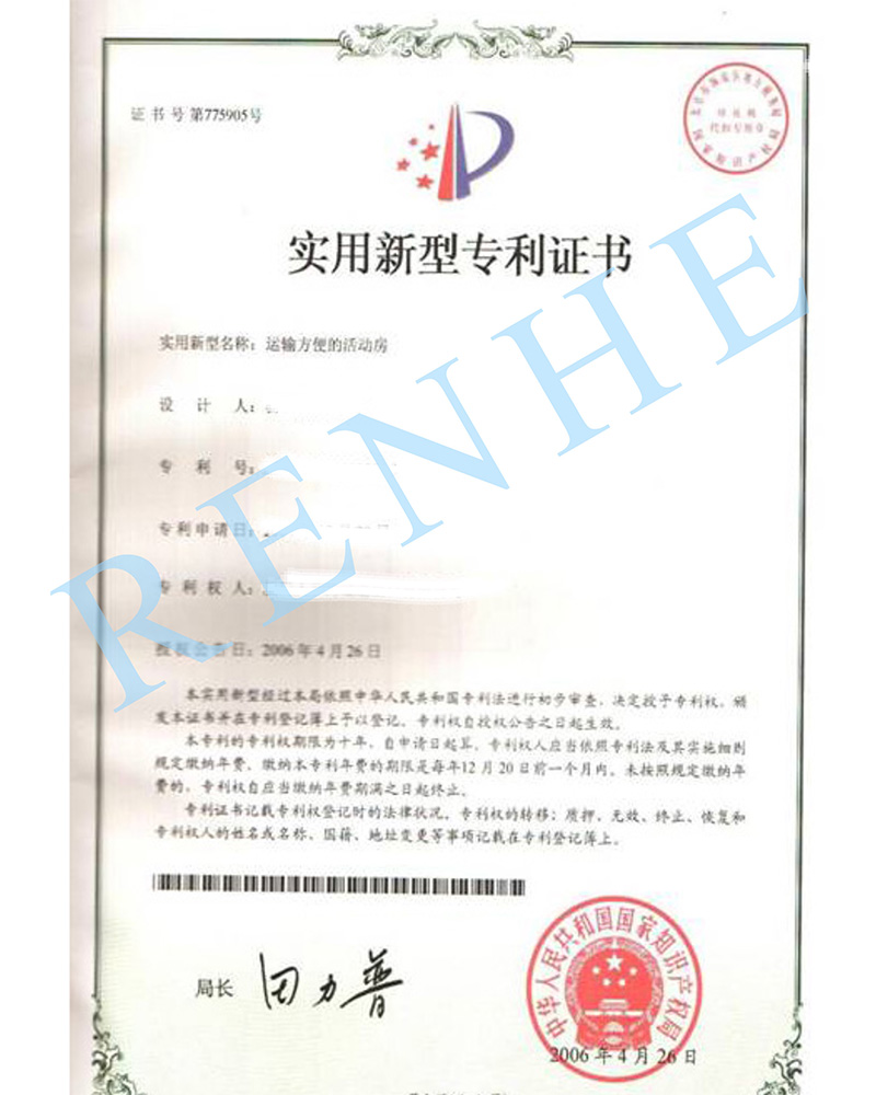 運(yùn)輸方便的活動(dòng)房實(shí)用新型專利證書